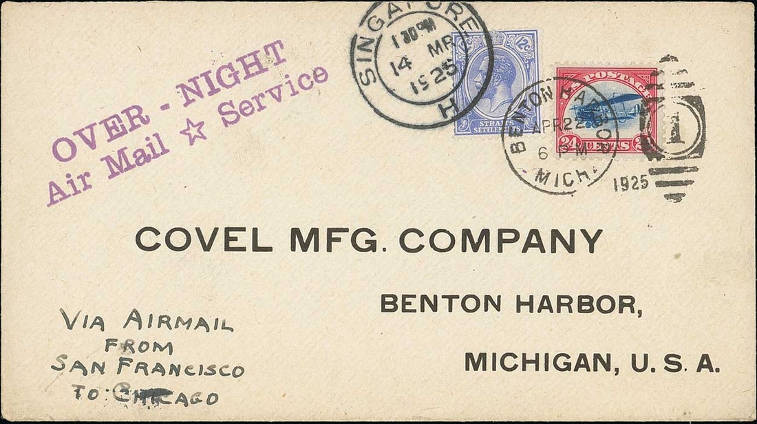 1925 (14 Mar.) envelope from Singapore to Michigan, marked "Via Airmail from San Francisco to Chicago", bearing Straits 12c.tied by Singapore double-ring d.s., showing "over - night/Air Mail (Star) Service" h.s. in purple, and with US Air 24c. affixed and cancelled on arrival at Benton Harbor. Rare and most attractive, only 4 covers recorded. Photo