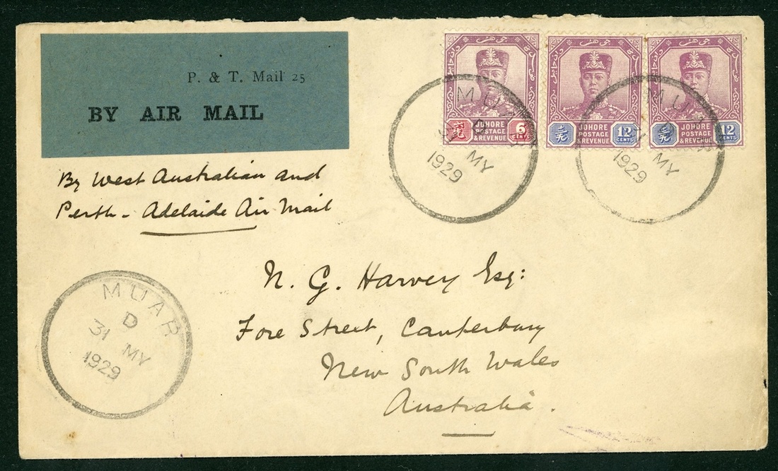 1926 (27 Oct.) envelope (a few tone spots) to Penang, marked "Via Air Mail from Perth to Derby", franked at 4½d., flown by Western Australian Airways Ltd, then by sea to Singapore (18.11) and rail to Penang (20.11); 1929 (31 May) envelope from Muar (Johore) to New South Wales, marked "By West Australian and Perth - Adelaide Air Mail", franked at 30c., showing Air Mail etiquette with, on reverse, Johore (1.6) and Ship Room Western Australia (27.6) datestamps