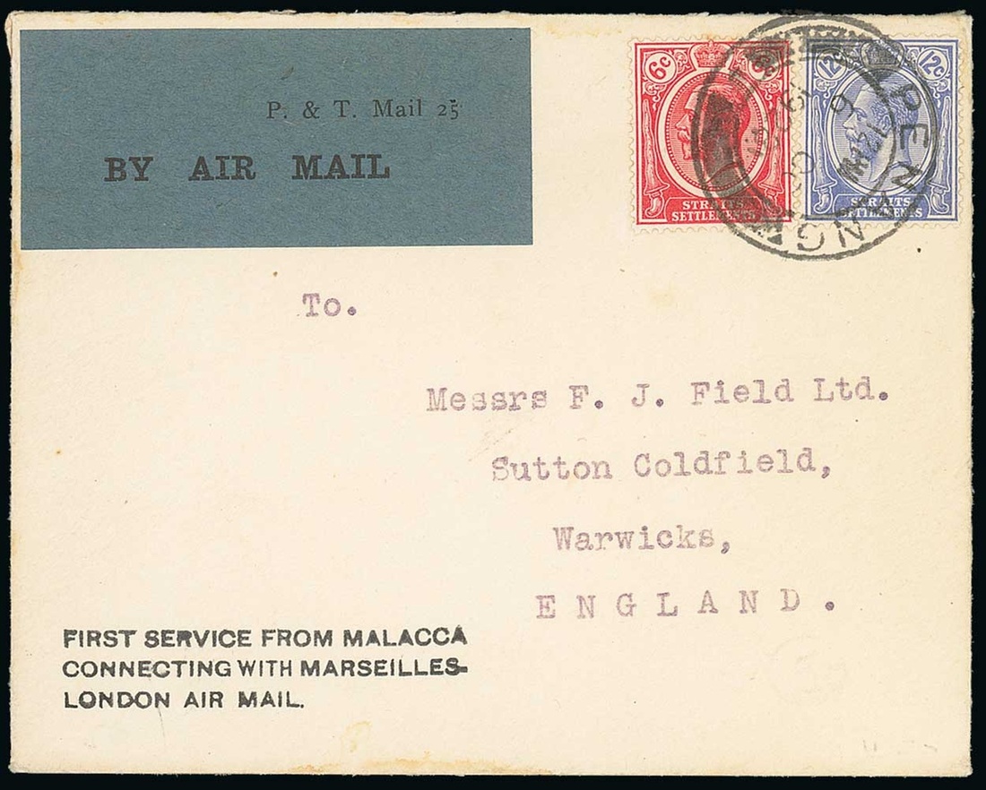 1928 (6 Oct.) "Field" envelope from Penang to England, franked at 18c., showing Air Mail etiquette and "first service from malacca/connecting with marseilles-/london air mail" h.s., fine. 65 items flown. Photo