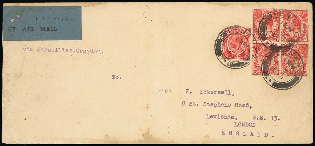 1928 (6 Oct.) commercial envelope (222x102mm.; small faults) from Penang to London, marked "via Marseilles-Croydon", franked at 18c. and showing Air Mail etiquette at upper left, no other markings. Uncommon commercial use. Photo