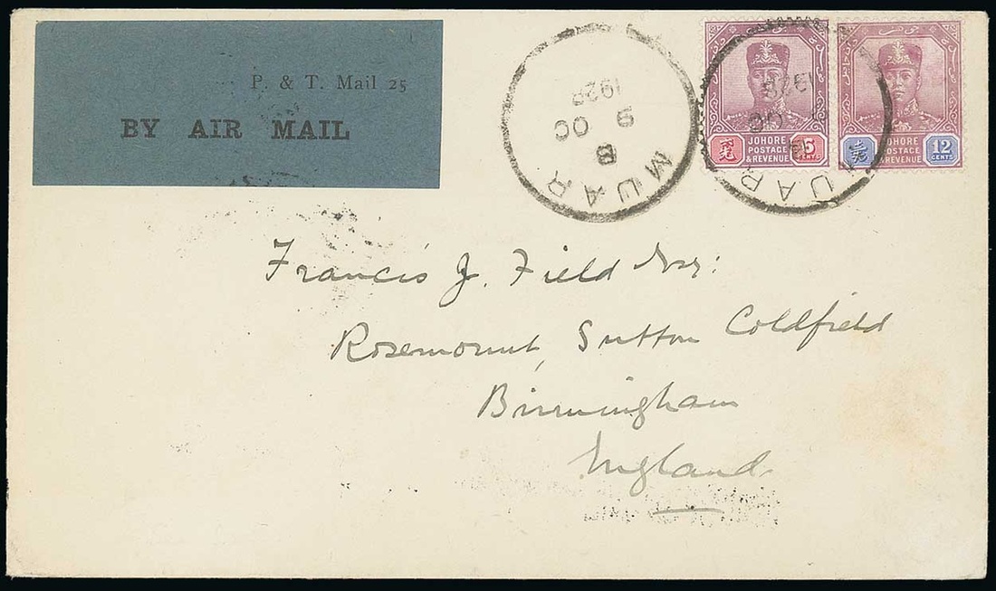 1928 (9 Oct.) "Field" envelope from Muar (Johore) to England, franked at 18c., showing Air Mail etiquette and, on reverse, "service from malacca/connecting with marseilles-/london air mail" h.s., Singapore (10.10) and Penang (12.10) datestamps, fine. 65 items flown. Photo