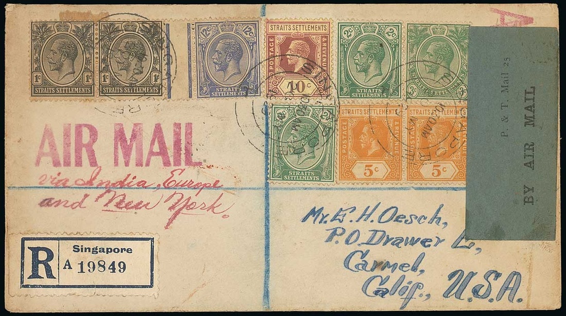 1929 (20 May) envelope registered from Singapore to California, marked "via India, Europe and New York", franked at 41c., showing "by air mail" etiquette at right, Singapore registration label at lower left and, on reverse, Penang (22.5), London (16.6), New York (26.6) and arrival (28.6) datestamps; the envelope with some light overall soiling. The earliest recorded Malayan airmail cover carried on the Karachi-London service, and nearly three months before the first acceptance of Malayan airmail by this Karachi-London service in August 1929. Photo