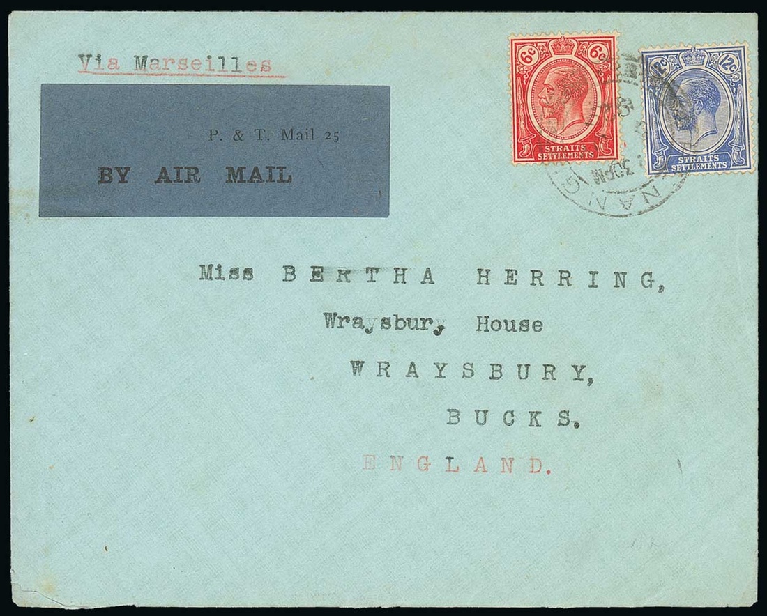 1929 (6 July) envelope from Penang to England, marked "Via Marseilles", franked at 18c. and showing "by air mail" etiquette at upper left. Photo