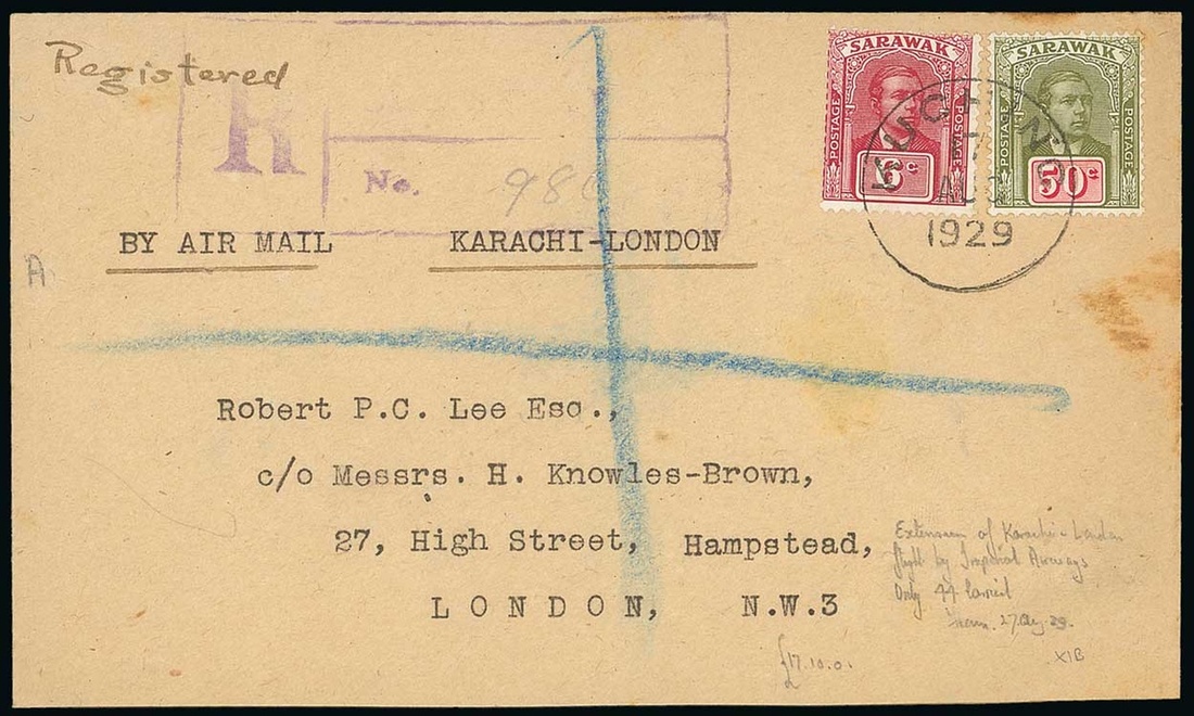 1929 (17 Aug.) envelope registered from Kuching to London, marked "By Air Mail" and "Karachi - London" and franked at 56c., no backstamps. Rare, about 44 letters carried. Photo