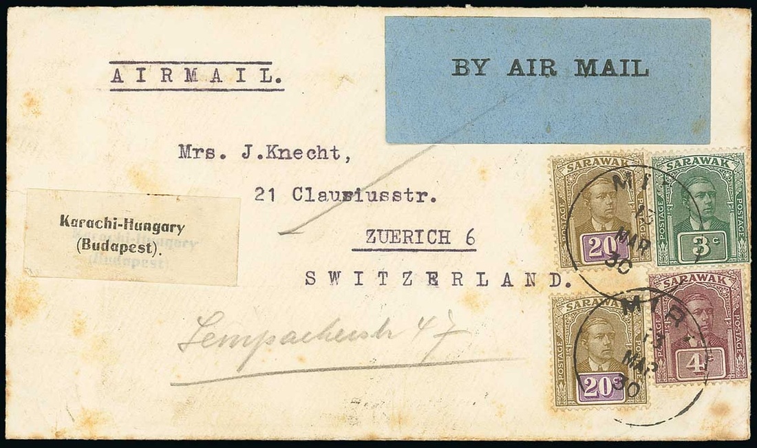 1930 (13 Mar.) envelope from Miri to Switzerland, franked at 47c., showing "by air mail" etiquette, "Karachi - Hungary, (Budapest)" label and, on reverse, Penang transit d.s. (18.3); the envelope slightly creased and with some minor tone spots. Photo