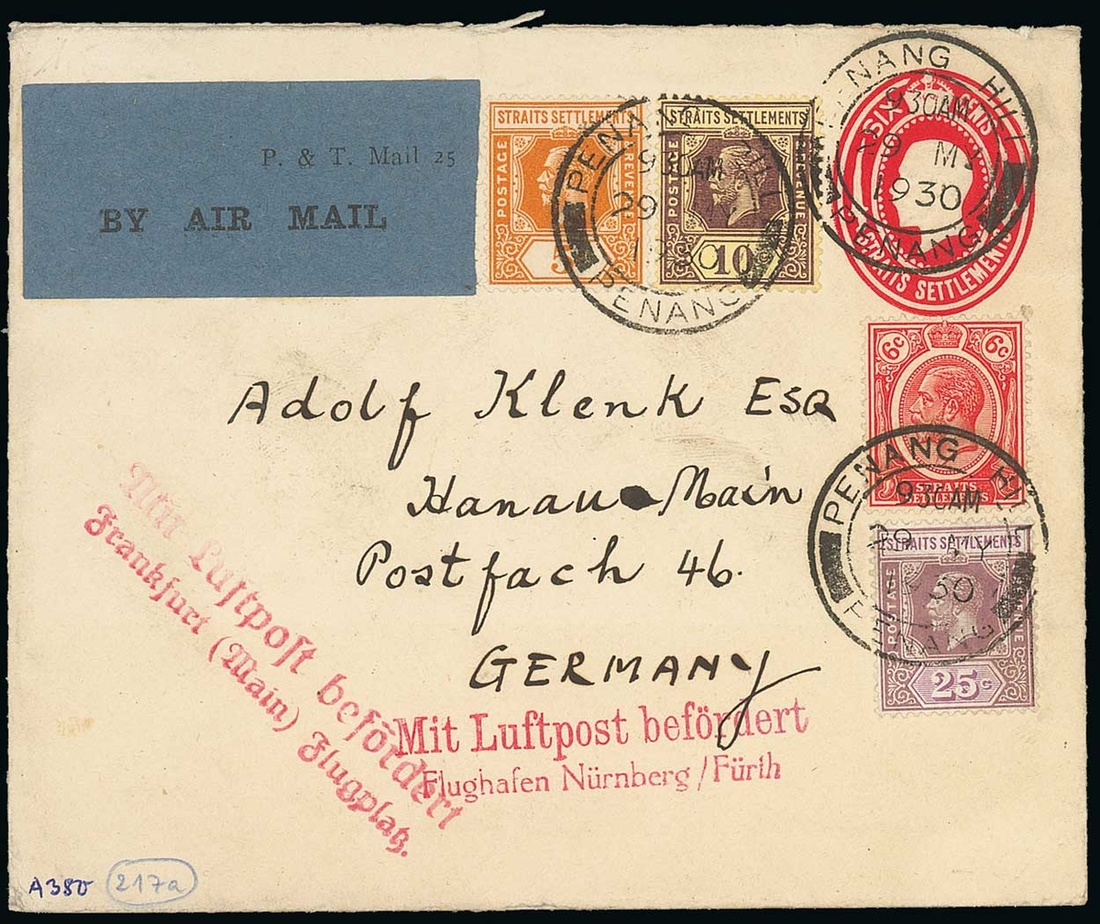 1930 (29 May) 6c. stationery envelope from Penang to Germany, uprated 46c. and cancelled by "penang hill/penang" double-ring d.s., showing "by air mail" etiquette plus "Mit Luftpost befördert/Franfurt (Main) Flugplatz" and "Mit Luftpost befördert/Flughafen Nürnberg/Fürth" handstamps in red. A fine and most attractive double rate franking. Photo
