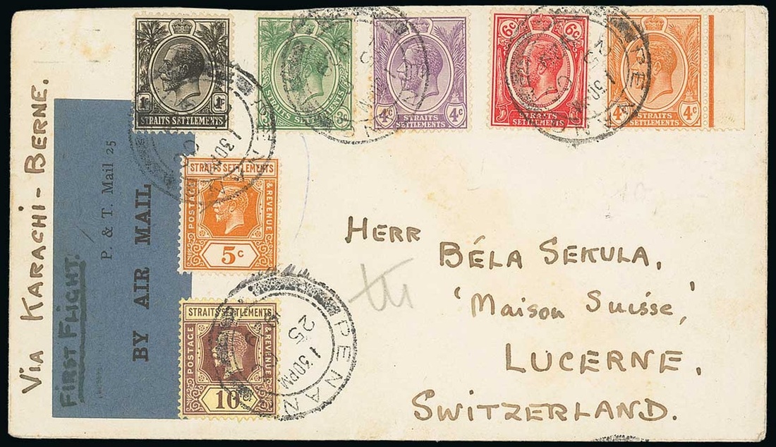 1929 (25 Oct.) envelope from Penang to Switzerland and carried on the first flight, marked "Via Karachi - Berne", franked at 33c. (1c. overpaid) and showing "by air mail" etiquette. Colourful. Photo