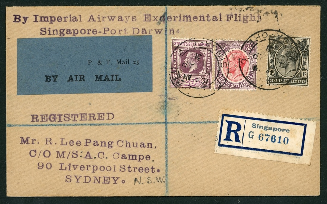 1931 (13 Apr.) Aero Philatelic Club of Calcutta envelope from Calcutta to Penang, marked "via Singapore", franked at 8a. and showing Singapore (16.4) and Penang (18.4) datestamps; 1931 (11Apr.) envelope registered from Singapore to Sydney, handstamped "By Imperial Airways Experimental Flight, Singapore - Port Darwin", franked at 61c. and showing "by air mail" etiquette with arrival d.s. (29.4) on reverse; and 1931 (3 Apr.) envelope registered from Melbourne to Penang, marked "Experimental Flight, Australia - Singapore", franked at 1/5d., showing special first flight cachet in violet, signature of Kingsford-Smith and, on reverse, Singapore (30.4) and arrival (1.5) datestamps