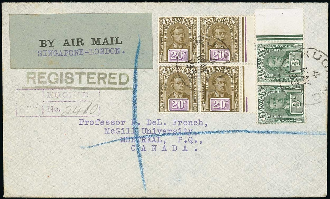 1931 (4 May) envelope registered from Kuching to Montreal, franked at 86c., showing "by air mail" etiquette with typed "singapore - London", violet registration handstamp and, on reverse, Singapore (8.5) and arrival (13.6) datestamps. Photo