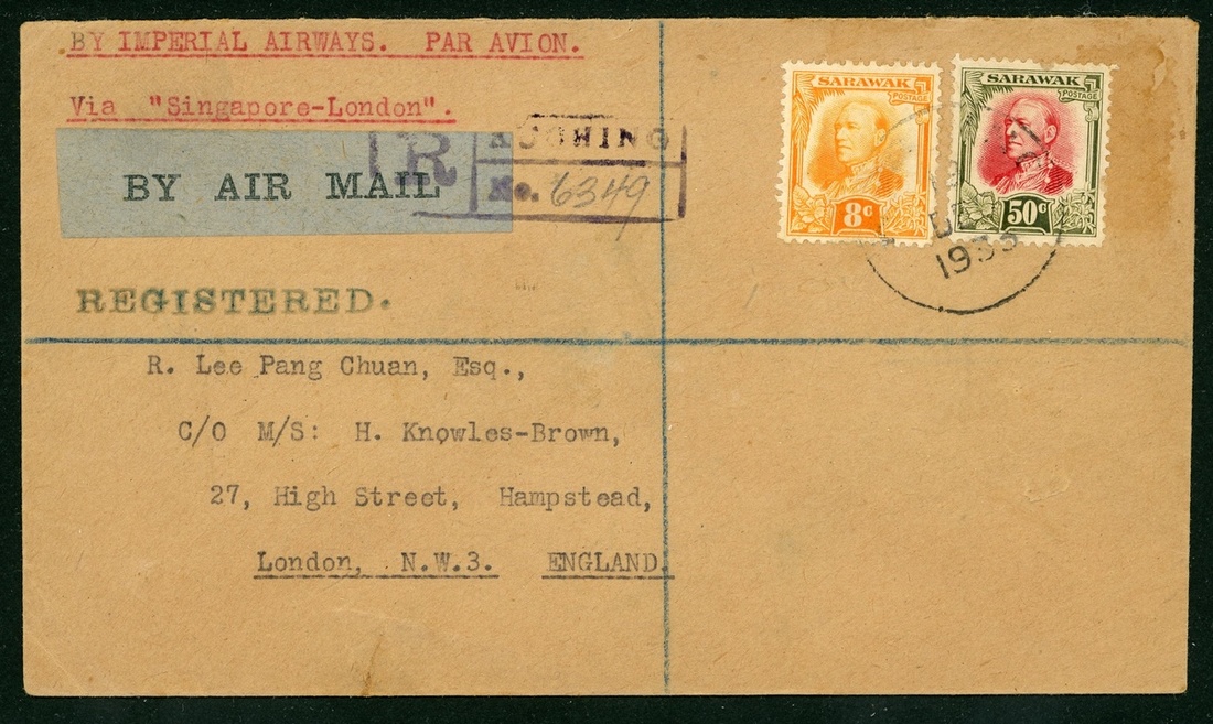 1933 (Dec.) envelope registered from Kuching to London, marked "By Imperial Airways, via Singapore - London", franked at 58c., showing "by air mail" etiquette with Singapore transit c.d.s. (23.12) on reverse