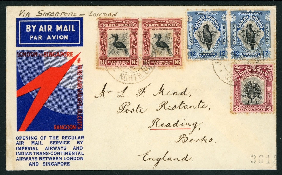 Note: Mail from North Borneo was accepted from 3 January 1934. The first airmail was forwarded on the second regular flight from Singapore to London, which left Singapore on 7 January.