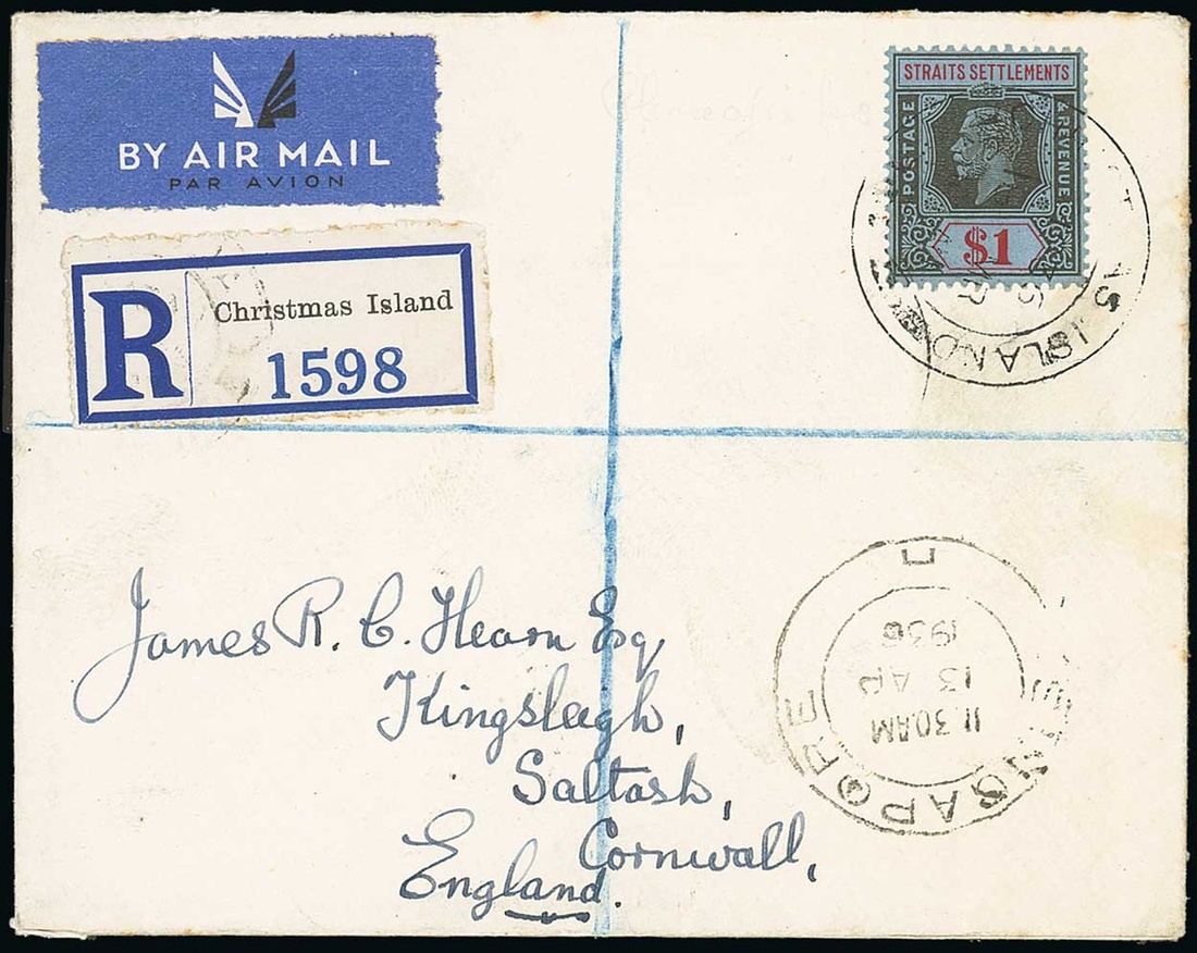 1936 (Apr.) envelope registered from Christmas Island to Cornwall, bearing Straits Settlements $1 tied by "christmas island" double-ring d.s. (Proud Type D6 but with year at top), showing registration label, Singapore transit d.s. (13.4) and, on reverse, arrival d.s.; also the registration receipt. Photo