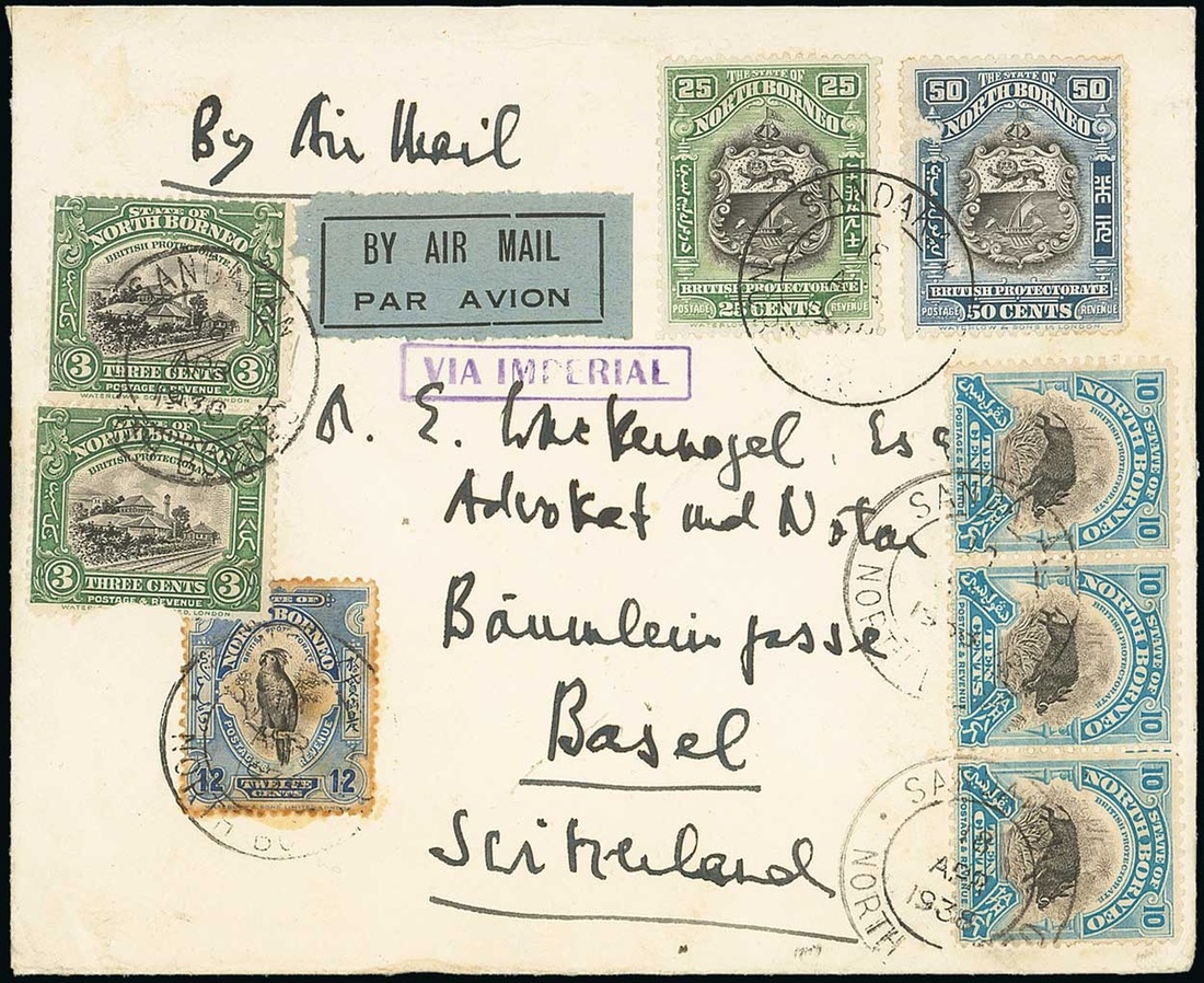 1931 (18 Apr.) envelope from Sandakan to Switzerland, franked at $1.26 (some of the stamps with faults), showing framed "via imperial" in violet and, on reverse, Jesselton transit datestamp. Photo