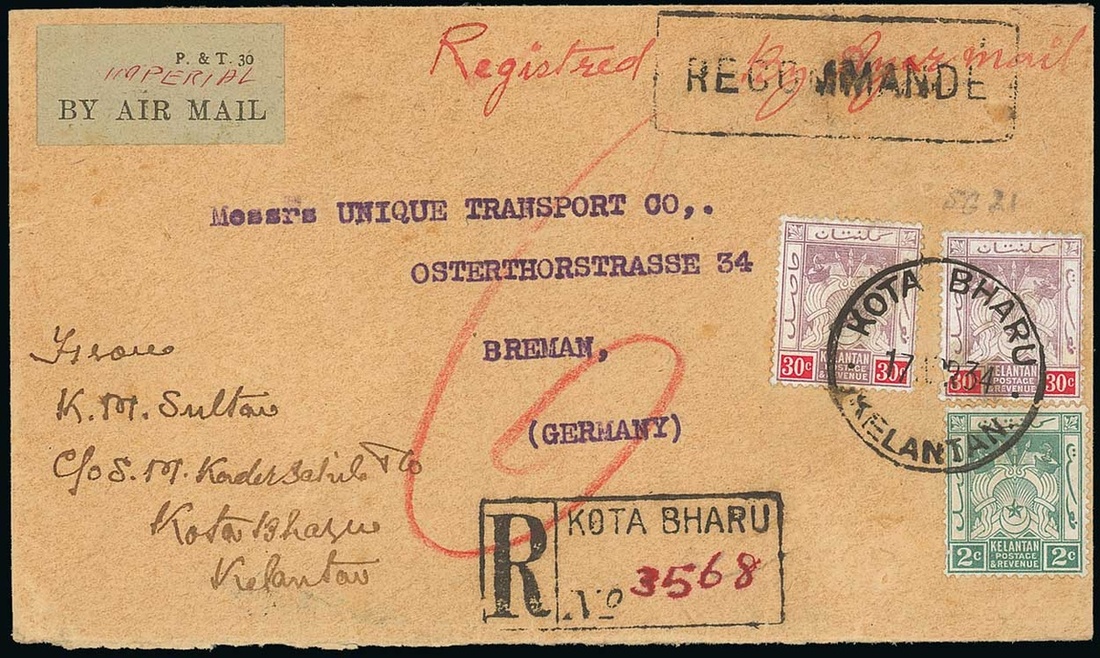1934 (17 Apr.) envelope registered from Kota Bharu to Germany, franked at 62c., showing registration handstamp, "by air mail" etiquette, framed "recommandé" and, on reverse, Penang (19.4), Brindisi (29.4), Milan-Chiasso (30.4) and Bremen (1.5) datestamps. Photo