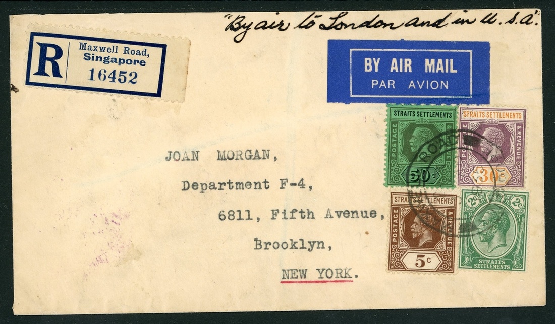 1935 (3 Apr.) envelope registered from Singapore to New York, marked "By air to London and in USA", franked at 87c. with "maxwell road/singapore" double-ring d.s. and showing various arrival datestamps on reverse. A neat and attractive franking