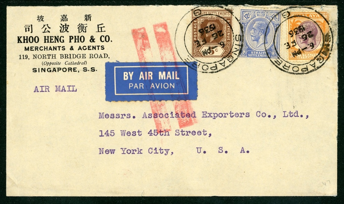 1936 (26 Feb.) envelope from Singapore to New York, franked at 47c. and showing Airmail label crossed by two red bars. Attractive