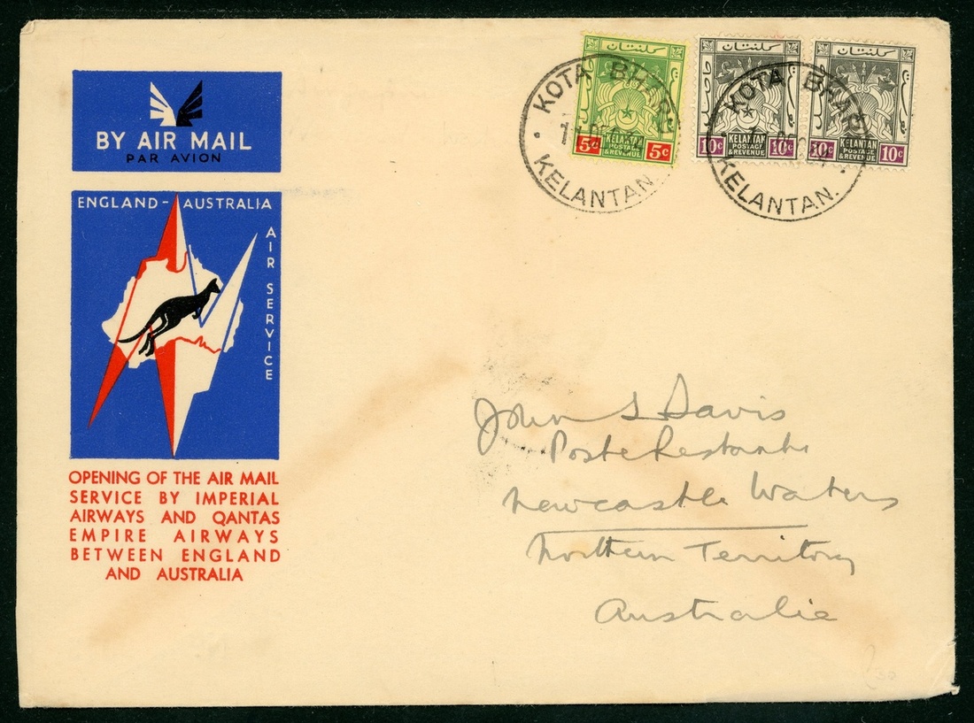 1934 (11 Dec.) envelope from Kota Bharu to Northern Territory, franked at 25c. and showing Newcastle Waters arrival datestamp on reverse