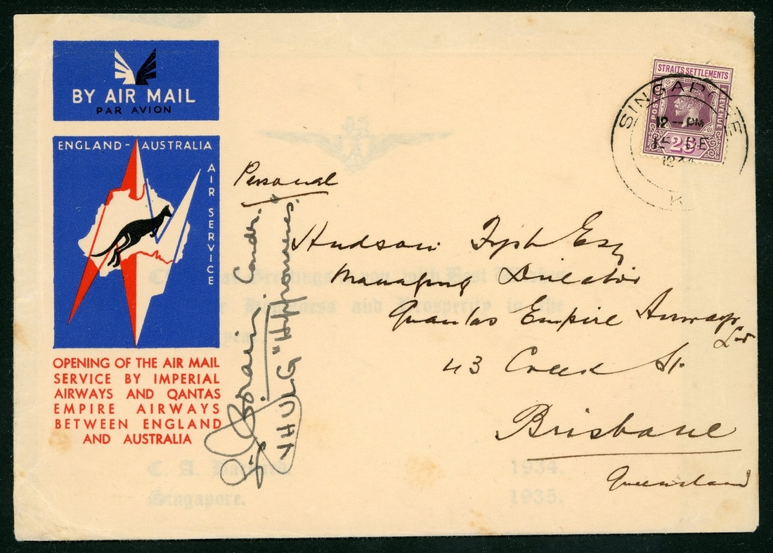 1934 (15 Dec.) envelope from Singapore to Brisbane and carried on the first return flight, franked at 25c. and signed by Lester Brain, Commander of the "Hippomenes", fine