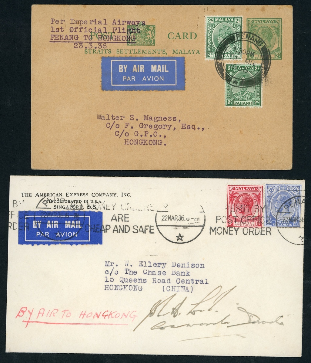 1936 (22 Mar.) envelope from Penang to Hong Kong, marked "By Air to Hong Kong", franked at 12c. and signed by J.H. Lock, the pilot; and (1 Mar.) 2c. stationery card from Penang to Hong Kong, marked "Per Imperial Airways 1st Official Flight Penang to Hong Kong 23.3.36" and uprated 4c.; fine