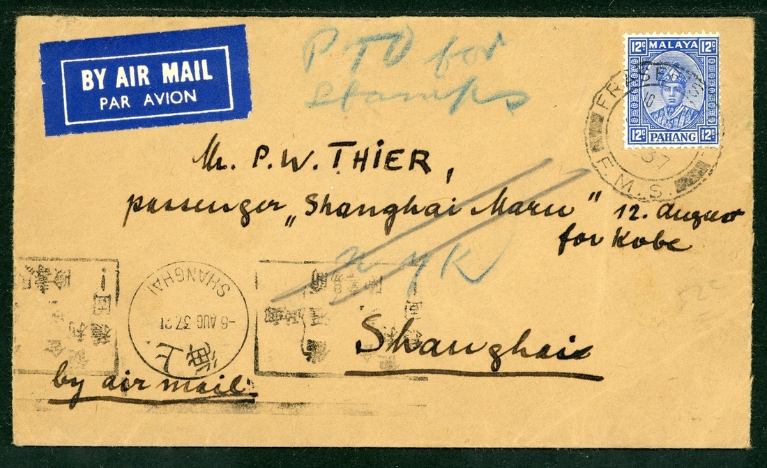 1937 (31 July) envelope (opened-out) from Frazer Hill (Pahang) to Shanghai, flown by Imperial airways to Hong Kong and CNAC to Shanghai, franked at 52c. and showing Shanghai arrival datestamps (6.8)