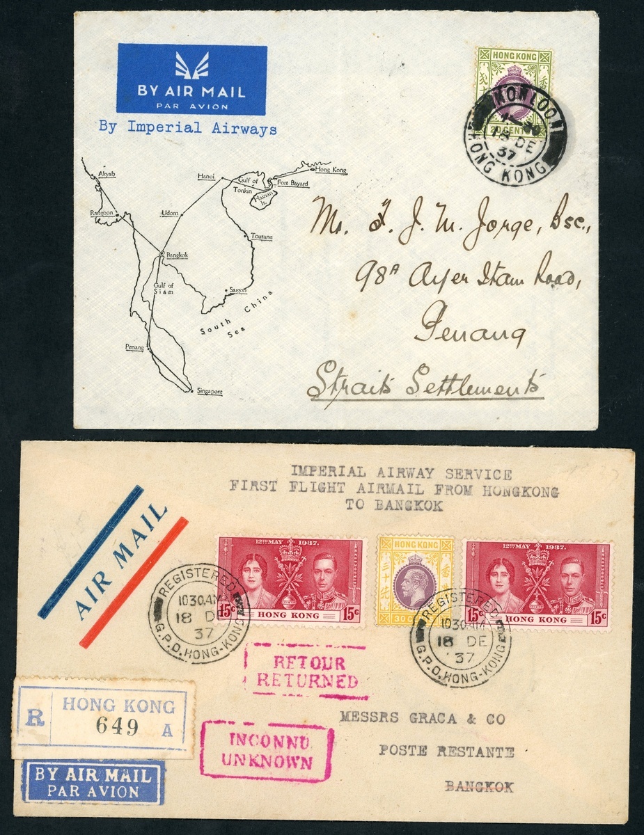 1937 (18 Dec.) envelope (2), one registered from Hong Kong to Bangkok, marked "Imperial Airways Service, First Flight Airmail from Hong Kong to Bangkok", franked at 60c.and showing framed "inconnu/unknown" and "retour/returned" in red with arrival datestamp (20.12) on reverse; the second from Kowloon to Penang, marked "By Imperial Airways" and franked at 20c.; fine