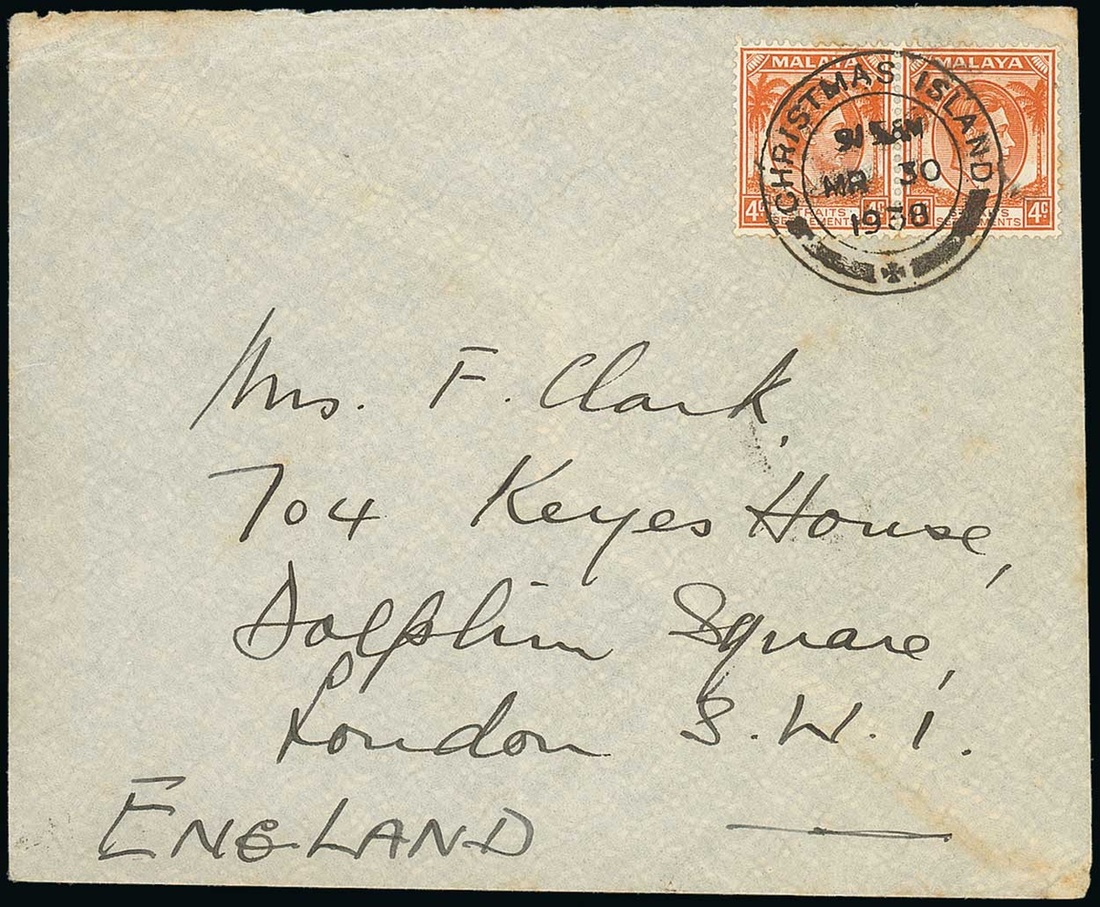 1938 (30 Mar.) commercial envelope from Christmas Island to London, franked at 8c. and cancelled by superb "christmas island" double-ring d.s.; some light creases. Photo