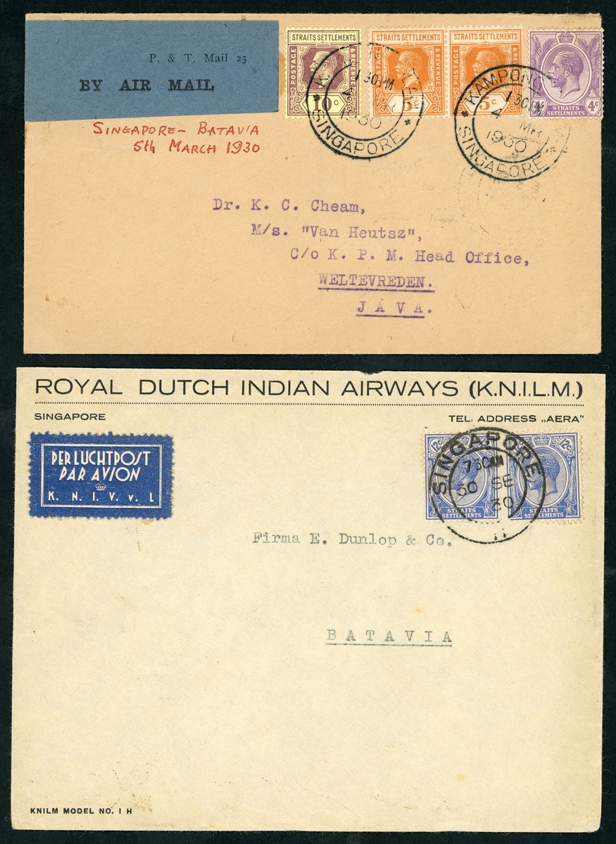 1930 (4 Mar.) envelope from Singapore to Welevreden, marked "Singapore - Batavia,5th March 1930", franked at 24c. with "kampong glam/singapore" datestamp, showing "by air mail" etiquette with despatch and arrival (5.3) on reverse; and 1930 (30 Sept.) "royal dutch indian airways (k.n.l.m.)" envelope from Singapore to Batavia, franked at 24c. and showing arrival d.s. (1.10) on reverse, the envelope with part of flap missing