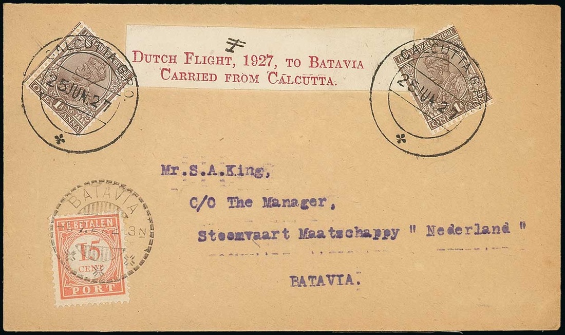 1931 (10 Aug.) envelope registered from Kuching to Batavia, marked "By Air Mail Singapore - Palembang Batavia, franked at 32c., showing "by air mail" etiquette and, on reverse, Singapore (12.8) and Batavia (14.8) datestamps and bi-lingual "Niet afgehaald" label; the envelope returned to Kuching showing Batavia (14.10), Singapore (19.10) and Kuching (26.10) datestamps. Scarce. Photo
