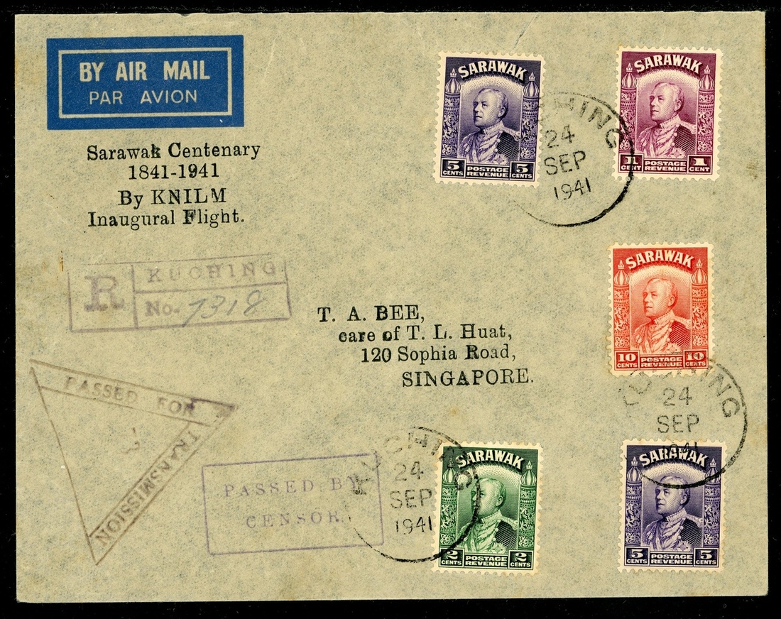 1941 (24 Sept.) envelope registered from Kuching to Singapore, marked "Sarawak Centenary, 1841-1941, By KNILM, Inaugural Flight", franked at 23c., showing triangular "passed for transmission" and framed "passed by/censor" cachets with Singapore arrival d.s. (25.9) on reverse