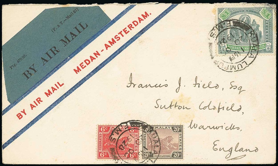 1928 (20 Oct.) "Field" envelope, with printed "by air mail medan - amsterdam", from Kuala Lumpur to Birmingham, franked at $1.26, showing "by air mail" etiquette and, on reverse, Penang (22.10) and arrival (16.11) datestamps. Photo
