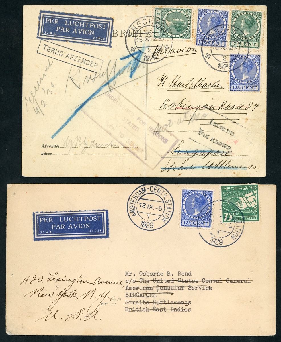 1929 (12 Oct.) envelope from Amsterdam to the American Consulate in Singapore and re-addressed to New York, carried on the first test flight, franked at 87½c. and showing, on reverse, Medan (21.9) and Singapore (24.9 and 24.10) datestamps; and (15. Oct.) card (folded) from Enschede to Singapore, carried on the seventh test flight, franked at 35c. (10c. underpaid), showing various instructional markings including framed "Inconnu/Not known", "undelivered for reasons/stated/return to sender", "terug afzender" and, on reverse, Singapore datestamp (11.12) and oval-framed "dead letter office/singapore" d.s. in red