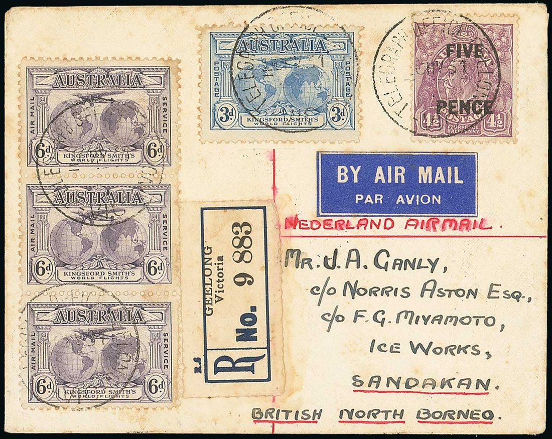 1931 (20 May) envelope registered flown from Melbourne to Batavia, then by surface to Singapore and on to Sandakan, marked "Nederland Airmail", franked at 2/2d. and showing, on reverse, Melbourne, Sydney, Batavia, Singapore and arrival datestamps plus two special flight cachets, one in violet. Scarce. Photo