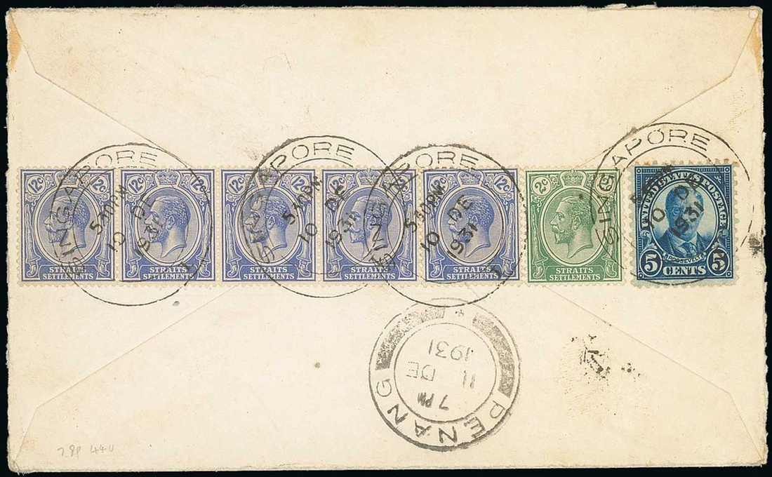 1931 (10 Dec.) envelope (opened-out) from Singapore to San Francisco, marked "Via Alor Star" and "Air Mail New York - San Francisco", franked (on reverse) 62c. in combination with US 5c., all tied by Singapore double-ring d.s., showing Penang datestamp (11.12) alongside with "by air mail" etiquette (crossed by two red lines) on face. The only KLM combination airmail cover recorded. Photo