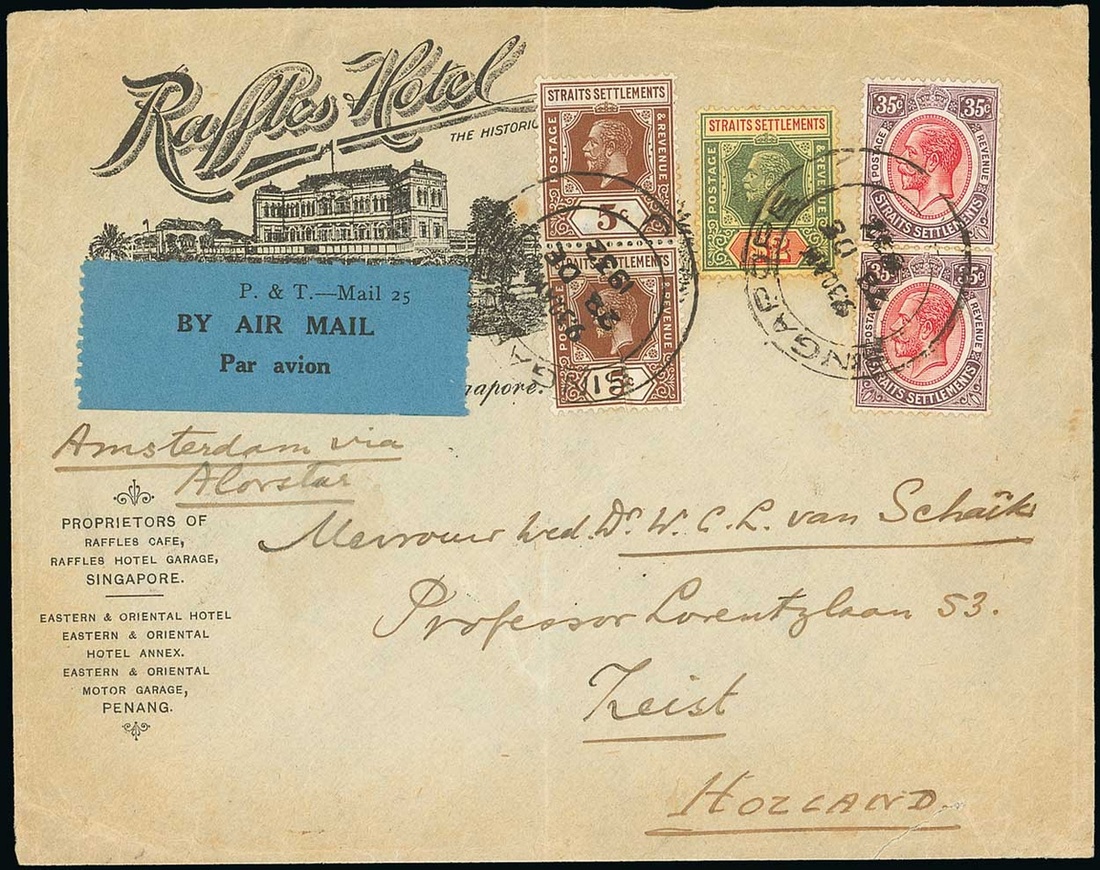 1932 (28 Dec.) "Raffles Hotel" envelope from Singapore to Holland, marked "Amsterdam via Alor Star", franked at $2.80 and showing "by air mail" etiquette; the envelope with central vertical fold. Photo