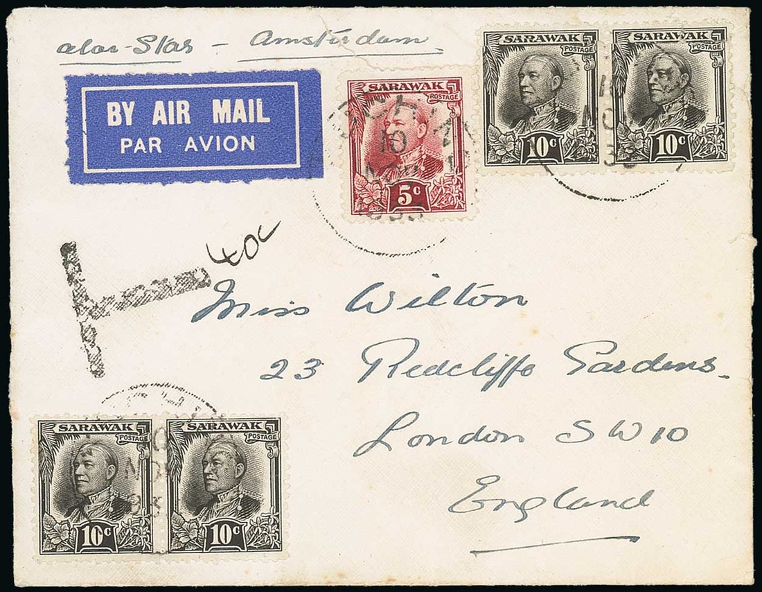 1933 (10 Nov.) envelope from Kuching to London, marked "Alor Star - Amsterdam", franked at 45c. and showing large "T" h.s. (Proud Type UP2); envelope with part flap missing. Photo