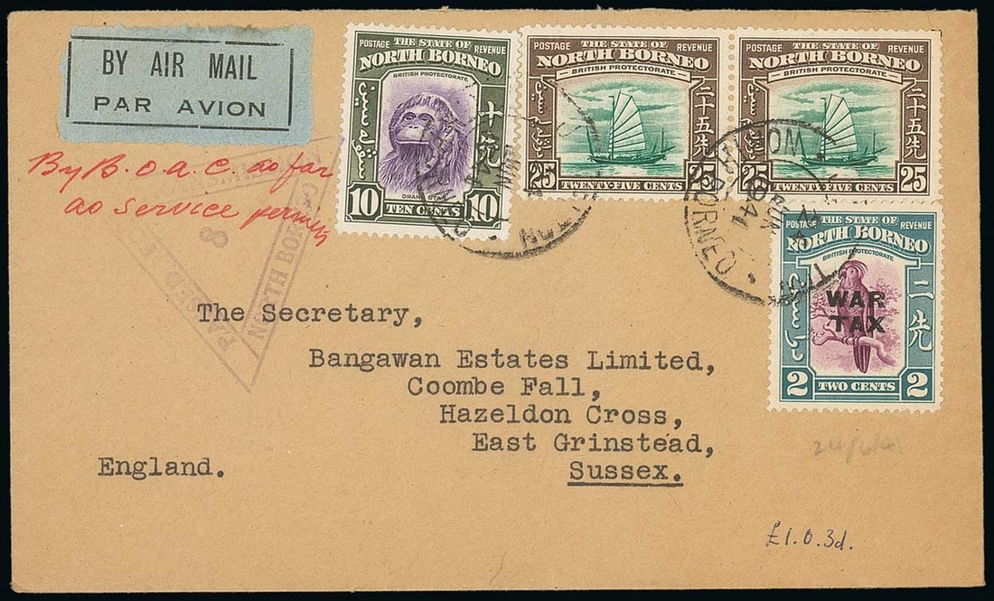 1941 (24 June) envelope from Kudat to Sussex, marked "By BOAC as far as service permits", franked at 60c. plus 2c. War Tax and showing light triangular "passed for transmission/north borneo" cachet in violet. Photo