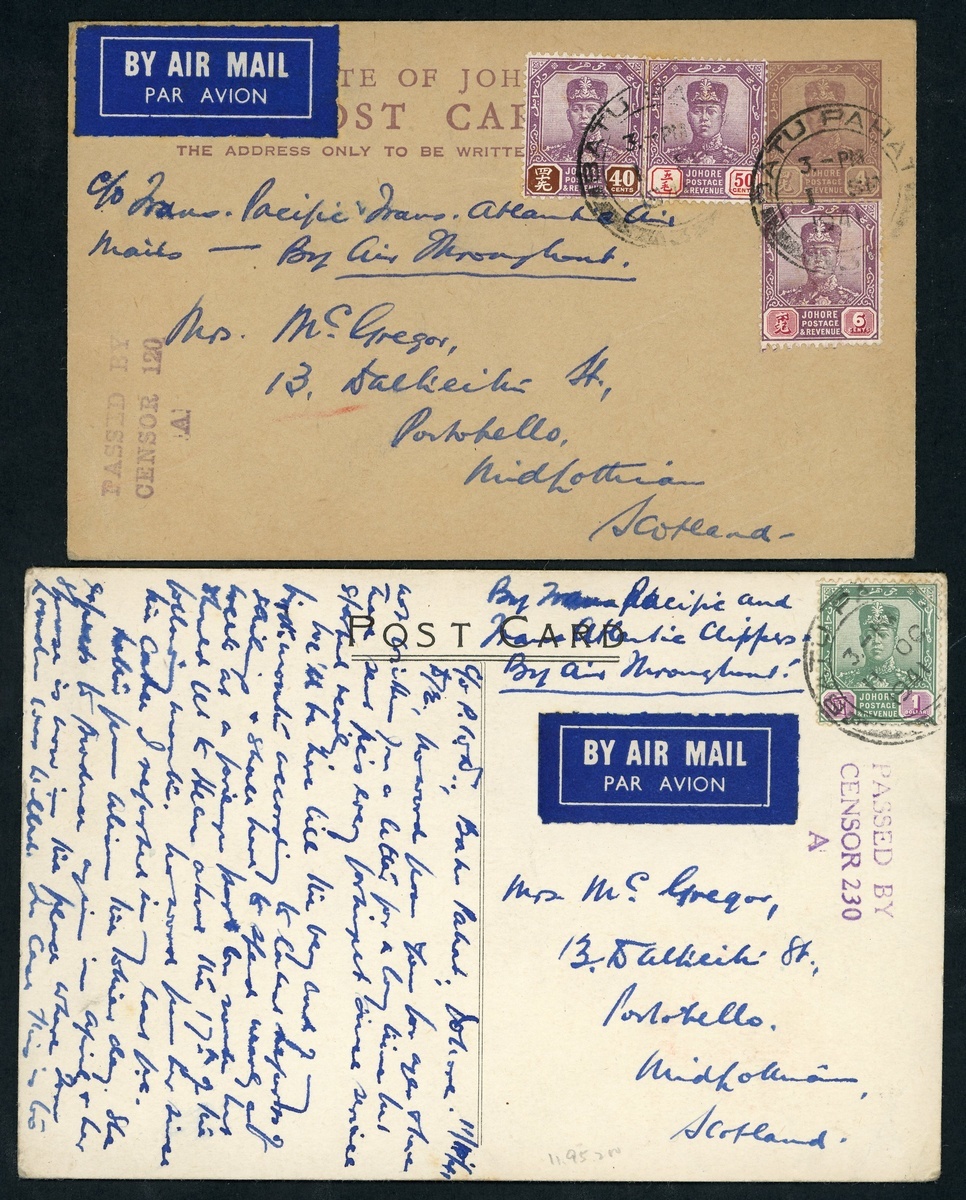 1941 (1 Sept.) Johore 4c. stationery card to and (11 Oct.) postcard, both from Batu Pahat (Johore) to Scotland, franked at $1 and showing violet Censor cachet. A fine pair