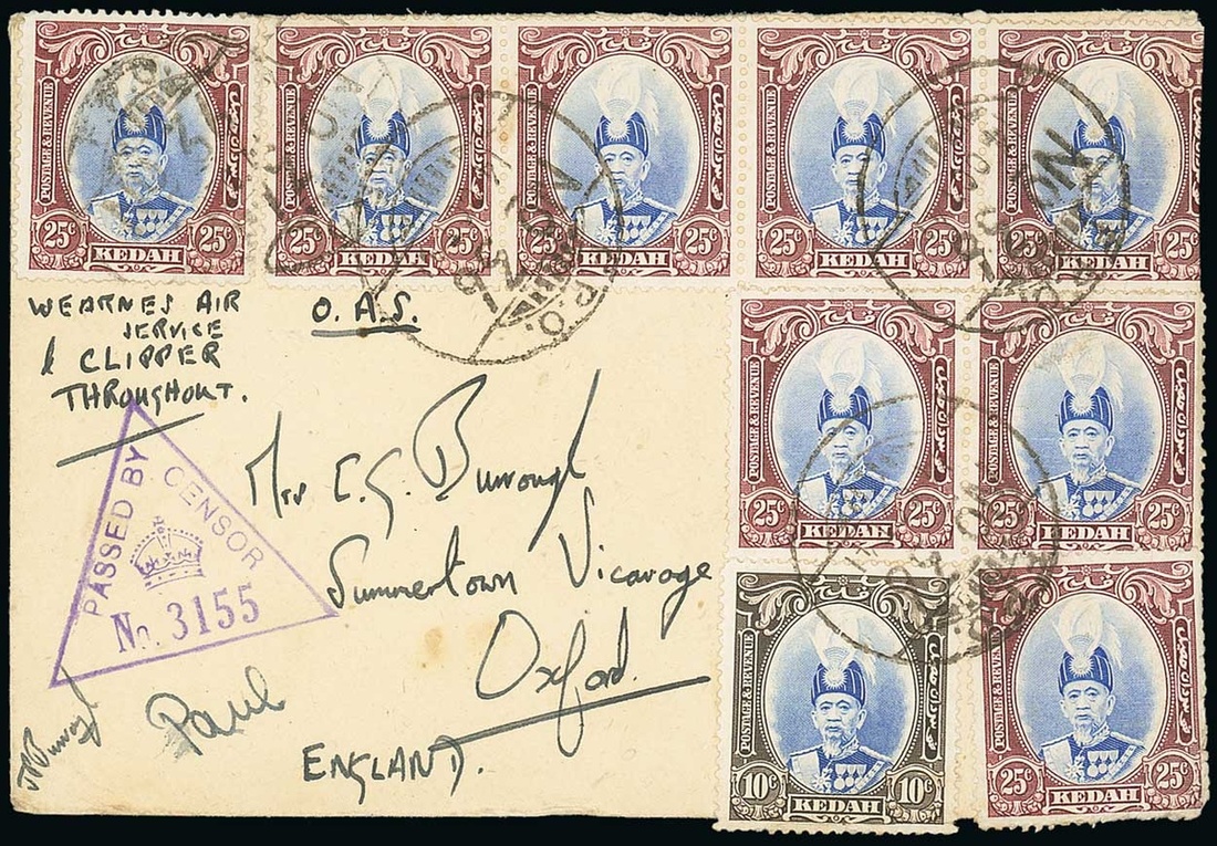1941 (14 Oct.) envelope from Sungei Patani (Kedah) to Oxford, marked "Wearnes Air Service & Clipper throughout", franked at $2.10 and cancelled by Indian FPO No. 36 and showing violet Censor cachet; some stamps damaged due to being affixed over edge of envelope. Scarce. Photo