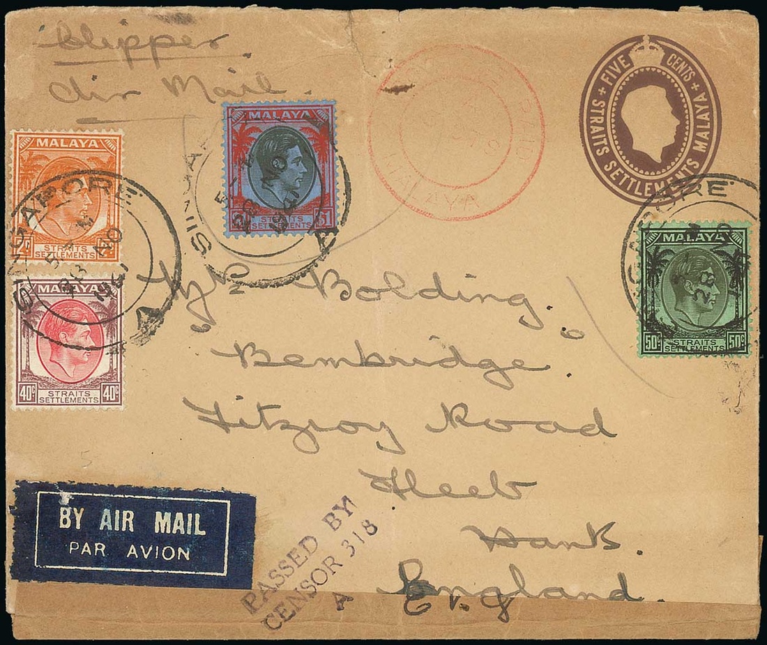 1941 (28 Nov.) Straits Settlements 5c. stationery envelope with circular "postage/paid/cents 2" in red alongside, from Singapore to England, uprated $1.92 and showing brown sealing tape and Censor cachet at foot; the envelope with some light overall discolouration and tear at top. Rare, only two recorded. Photo