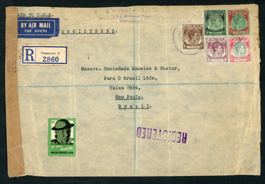 1941 (20 Sept.) envelope (230x150mm; folded and with peripheral creases) registered from Singapore to Sao Paulo, Brazil, franked at $7.65 for 2½oz. rate, showing brown sealing tape and violet Censor cachet at left and with green Malaya Patriotic Fund label affixed. The only cover recorded at this rate. Photo