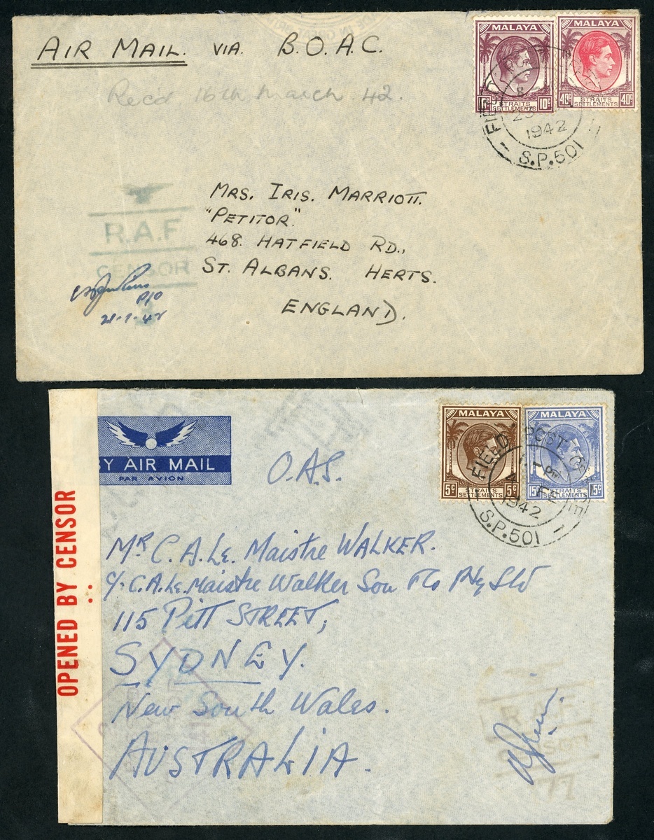 1941 (20 Dec.) envelope from Brisbane to Perak, carried by Qantas to Singapore, franked at 9½d., showing Censor label at left tied by cachet, framed "no service" and "retour" h.s. due to most of northern Malaya being occupied; 1942 (23 Jan.) envelope from Singapore to England and carried by shuttle service to Batavia, then via Port Blair and Rangoon, franked at 50c. with FPO SP 501 datestamp and showing RAF Censor cachet; and 1942 (4 Feb.) envelope from Singapore to Sydney, marked "OAS" and carried by the last flying-boat out of Singapore (the "Camilla" captained by W.H. Crowther) on the shuttle service from Tjilatjap to Broome (the Singapore to Batavia shuttle ceased operation on 6 February), franked at 20c. (5c. underpaid) and showing Censor label and cachets. A very good group of covers