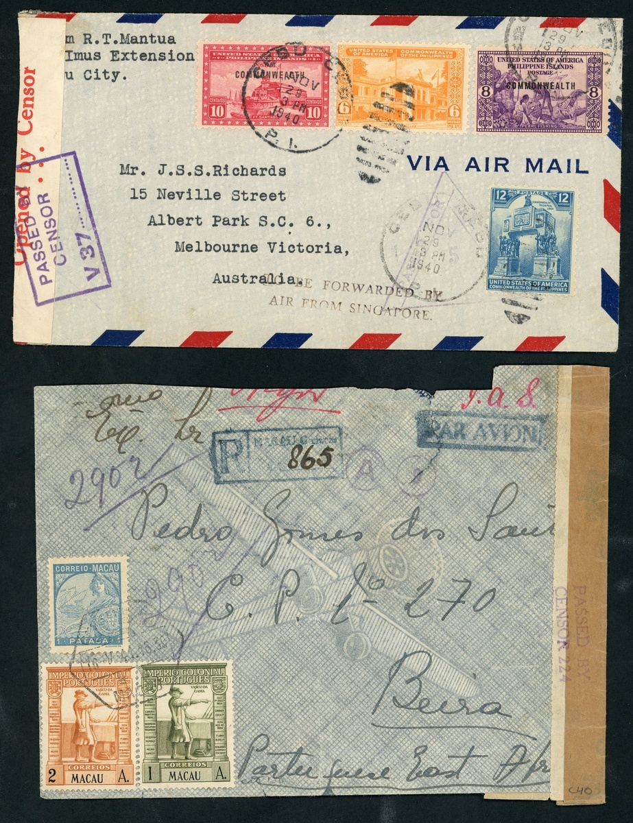 1940 (22 Sept.) envelope from Hong Kong to Bangkok (franked at 30c.) and re-addressed to Los Angeles, taken by ship to Singapore where "b" and "24" sorting marks were applied, and then by BOAC to Bangkok; 1940 (29 Nov.) envelope from Philippines to Melbourne, franked at 36c., showing "to be forwarded by/air from singapore" h.s. and two different Censor markings; and 1941 (16 May) envelope registered from Macau, via Hong Kong and Singapore, to Beira, Mozambique, franked at 83a.1p , censored in Hong Kong and Singapore, and showing Singapore "a" and "9" sorting marks; a few small faults
