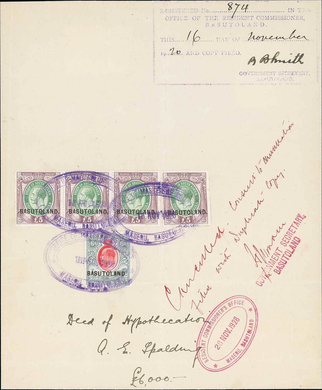 1920 (16 Nov.) Deed of Hypothecation page bearing series 15 £5 (4, including a strip of three), and series 13 6/-, cancelled by "office of master of court/ maseru basutoland" oval datestamps in violet, filing creases running through the rightmost £5 and 6/- still fine and rare multiple usage. Photo