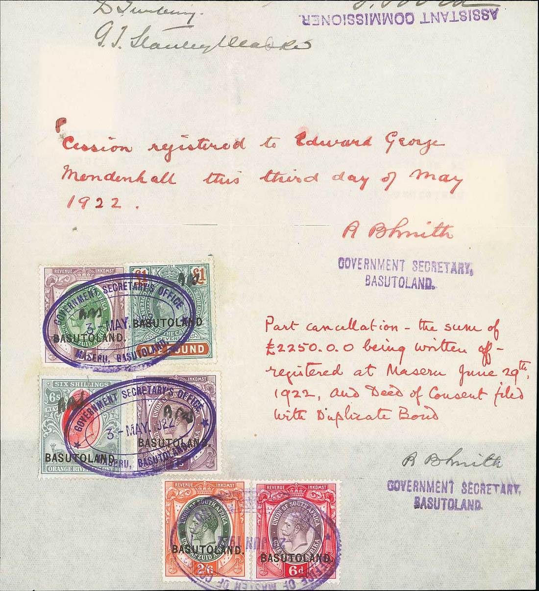 1922 (3 May) cession of bond document page bearing series 13 6/- and £1, and series 15 1/- and £5, cancelled by "government secretary's office/ maseru basutoland" h.s., with Series 15 6d. and 2/6d. added later when the remaining amount was cancelled, the pair cancelled by "office of master of court" oval h.s. dated "29 jun 1932". vertical filing crease runs though 2/6d. though a most attractive and colourful franking. Very rare. Photo