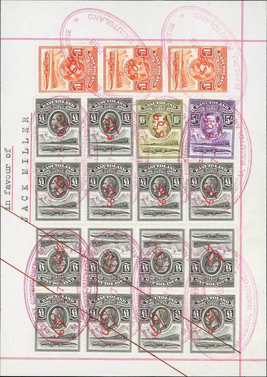 1933 KGV issue specialised collection of stamps (22) and document pieces (8) beautifully written up on exhibition pages including 1933 ½d. to 10/- set of ten perforated "specimen", fiscally used examples from 1d. to £1 black (33), the documents including passport page bearing 5/- violet (3), piece of mortgage bond bearing £1 black (14), Deed of sale bearing £1 black (3) and 1/- red-orange (3), Mortgage Bond bearing £1 black (5), 10/- and 1/- (2). A valuable and interesting lot showing a wide variety of usage. Photo