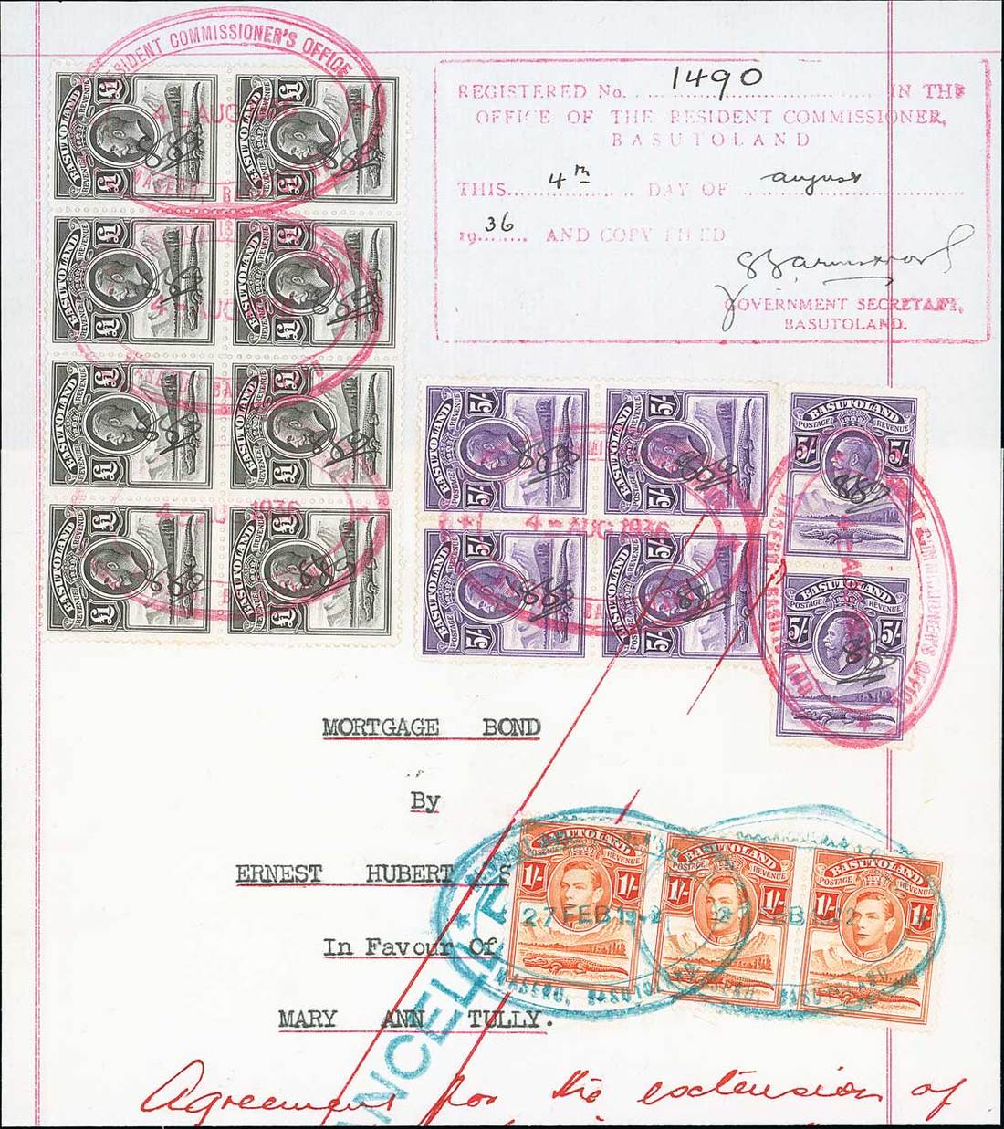 1936 (4 Aug.) Mortgage Bond page bearing 1933 £1 black block of eight (4x2), 1933 Postage/Revenue 5/- (6), each cancelled by "resident commissioner's office/ maseru, basutoland" oval d.s. in red and 1938 1/- (3), paying 3/- cancellation fee, dated "27 FEB 1942". Fine and attractive.