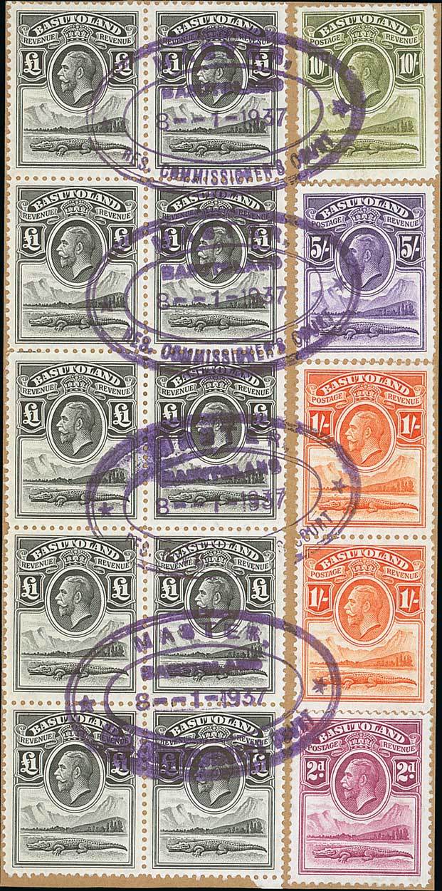 1937 (8 Jan.) document piece bearing 1933 £1 black block of ten (2x5), and Postage/Revenue 2d., 1/- (2), 5/- and 10/-, each row of three cancelled by "master/ basutoland/ res. commissioner's court" oval d.s. A marvellous five colour franking. Photo.