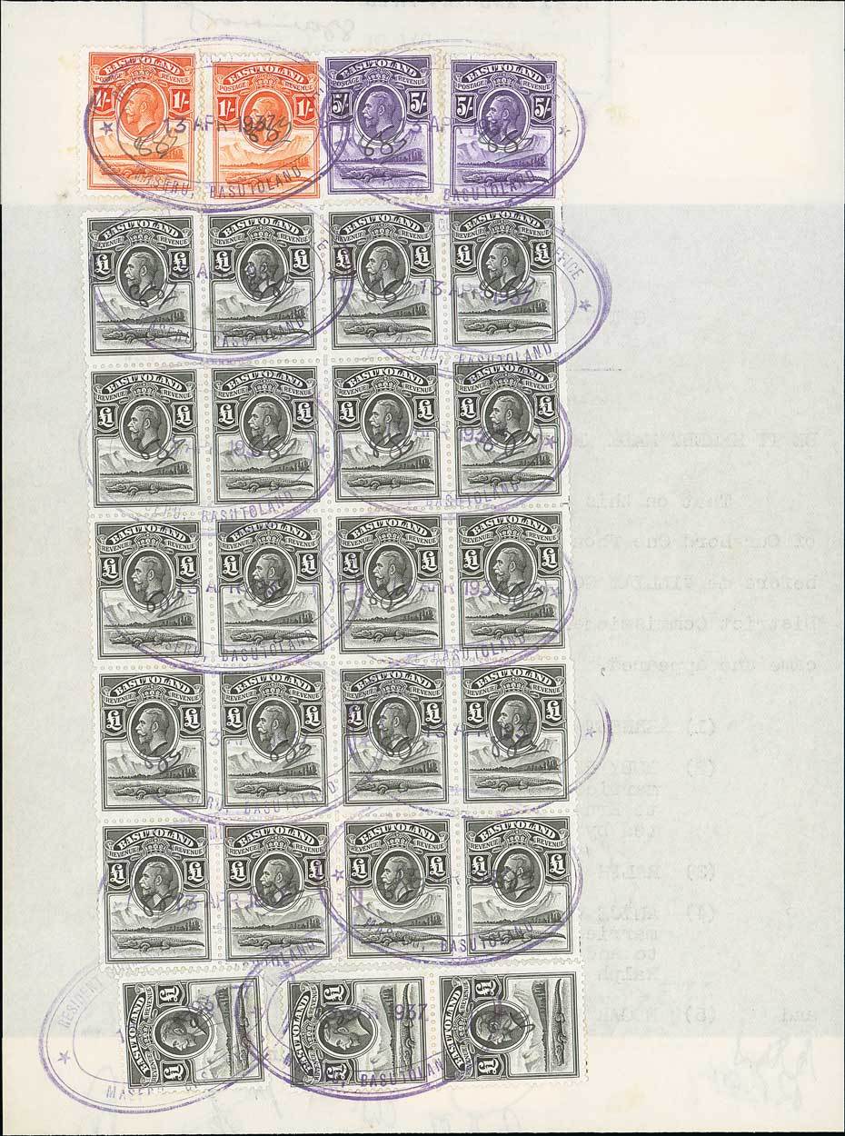 1937 (13 April) General bond page, the reverse bearing 1933 £1 black, block of twenty (4x5), three singles and postage/revenue 1/- (2) and 5/-(2), for a remarkable franking of £23/12/-, each pair neatly cancelled by light and crisply struck "resident commissioner's office/ maseru basutoland" oval d.s. in violet, and neat initials. Superb. Photo