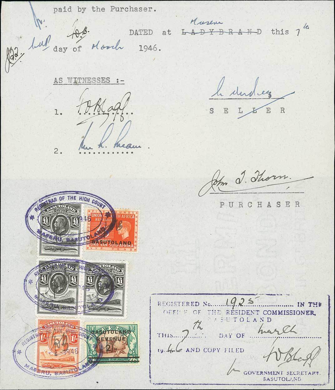 1946 (7 March) Deed of Sale piece bearing 1933 £1 black (3), 1945 Series 25 £5 bright orange, 1942 series 26 2/- brown and green, and 1938 Postage/Revenue 1/- orange, each row cancelled by "registrar of the high court/ maseru, basutoland" oval d.s. A desirable four colour franking, showing extremely rare use of the 1945 £5. Photo