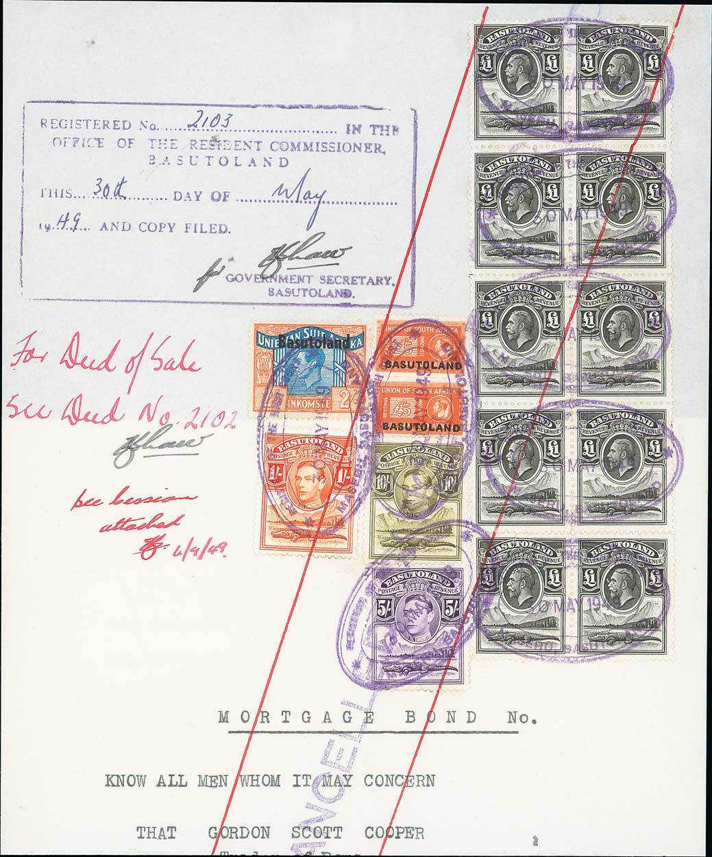 1949 (30 May) Mortgage Bond page bearing 1943 Series 31 £5 orange "Bantam" pair (a complete unit), 1933 £1 black block of ten (2x5), Series 34 2/- light blue and orange and 1938 Postage/Revenue 1/-, 5/- and 10/-, for a total franking of £20/18/-, cancelled by "registrar of the high court/ maseru, basutoland" oval datestamps in violet, with two red pen strokes applied to page after cancellation. A wonderful showpiece showing both rare bantam usage and a large multiple of the popular £1. Photo